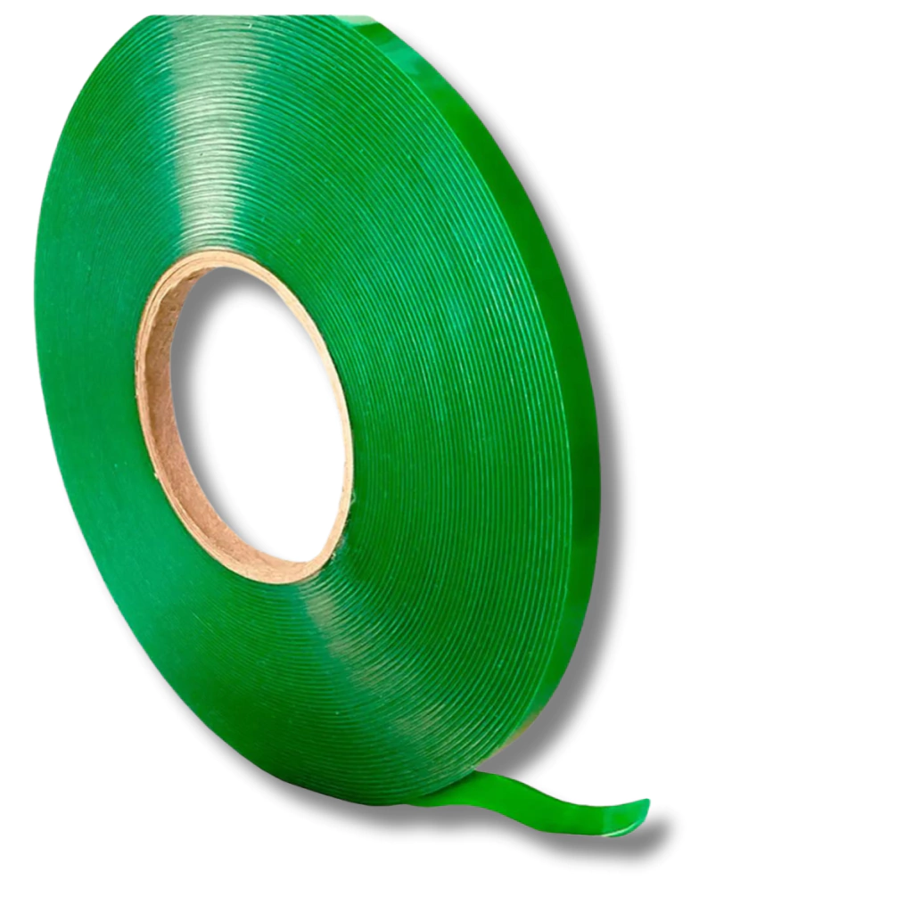 Composição: Massa adesiva acrílica transparente e liner verde.