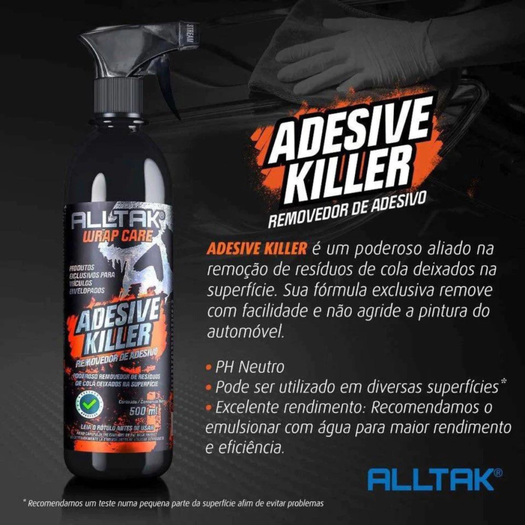 ADESIVE KILLER é um poderoso aliado na remoção de resíduos de cola deixados na superfície. Sua fórmula exclusiva remove com facilidade e não agride a pintura do automóvel.